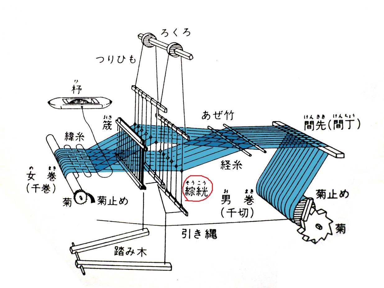 綜は ツウヂ(通ぢ) とも呼ばれ、二つを合せて今日「綜絖(そうこう)」と呼ぶ。